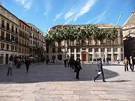 Durante el Reino nazarí ya era una plaza principal, conocida como la plaza de las Cuatro Calles o plaza Pública. Su estructura definitiva se conformó entre el siglo XV y el XVI, tal y como muestra un plano de 1571 ubicado en el Archivo municipal, y se configuran los principales edificios de la ciudad como el Ayuntamiento (hasta 1869)[1] las casas del corregidor y del cabildo malagueño, la cárcel, la Audiencia o las carnicerías. Posteriormente se construyó el convento de las Agustinas descalzas[2] y la sede de la Sociedad Económica de Amigos del País.