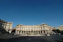 Antiguamente era conocida como plaza de la Exedra, por haber sido construida encima del antiguo emplazamiento de la exedra del edificio hecho en tiempos de Diocleciano. Los pórticos alrededor de la plaza fueron construidos en el siglo XIX por Gaetano Koch en memoria de las antiguas construcciones que se hallaban en el lugar. Por el contrario, la Basílica se construyó aprovechando un ala de las propias Termas.