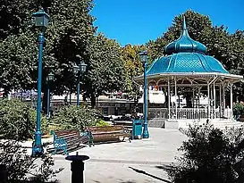 La plaza cuenta con áreas verdes, en los que destacan un buen número de tilos por todo el interior del parque. Éstos fueron el reemplazo de los antiguos arces que habían sido plantados dentro del parque, los cuales fueron quemados durante el gran incendio que asedió a la ciudad en 1909.[3] Asimismo, destaca como elemento arquitectónico central una glorieta a modo de odeón, además de bancas para el descanso de los visitantes repartidas por todo su interior.