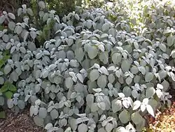 Alcanza un tamaño de 1 m de alto y ancho, es un arbusto de difusión de hoja caduca. Las hojas son peludas ovadas a ovadas amplias, de 5-11,5 cm de largo, y 3-5,5 cm de ancho con crenados márgenes. Los pelos dan a la planta de un color general verde a color plateado. Las flores nacen en terminales en forma de racimos de hasta 30 cm de largo y son de color blanco azulado.[1] [2]