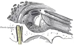 ![]() Vista de la pared interna del tímpano. (Los surcos para el plexo timpánico etiquetados en el centro). | ||