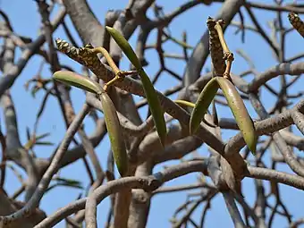 Estas especies solo producen semillas ocasionalmente, y cuando lo hacen la flor produce dos vainas duras, estrechas y puntiagudas, de unos 18 cm de largo con entre 20-60 semillas aladas.[2][3]