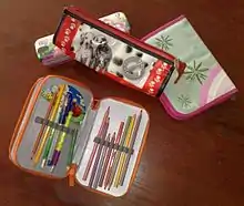 El estuche se abre como una carpeta y contiene material en sus dos lados opuestos. En uno se disponen, por ejemplo, los lapiceros de colores y en el otro, el sacapuntas, la goma, la regla, la escuadra y el transportador de ángulos. Existen estuches de diferentes tamaños y capacidades, algunos de ellos con dos niveles y dos cremalleras hechas de metal.