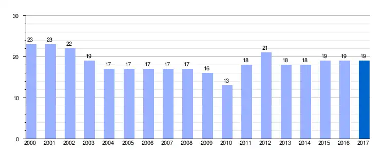 Gráfica de evolución demográfica de Pobladura de Luna entre 2000 y 2017 |