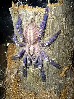 Los colores vívidos de la araña están producidas por nanoestructuras. Los colores estructurales son usualmente altamente iridiscentes, cambiando de color cuando son vistos desde diferentes ángulos (un efecto que se puede observar también en pavos reales y mariposas). Algunas especies de tarántulas azules tienen pelos con una "estructura especial similar a una flor" que ha sido hipotetizado como reductor de la iridiscencia, un efecto que está siendo usado para desarrollar nuevos materiales.[5][6]