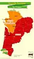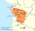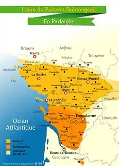 ![]() Área lingüística del dialecto poitevin-santongés, con los nombres de las ciudades en parlanjhe