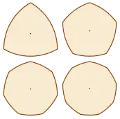 En geometría, un polígono de Reuleaux es una curva de ancho constante formada por arcos de radio constante.[1] Estas formas llevan el nombre de su ejemplo prototípico, el triángulo de Reuleaux, que a su vez, lleva el nombre del ingeniero alemán del siglo XIX Franz Reuleaux.[2] El triángulo de Reuleaux se puede construir a partir de un triángulo equilátero conectando cada dos vértices mediante un arco circular centrado en el tercer vértice, y los polígonos de Reuleaux se pueden formar mediante una construcción similar a partir de cualquier polígono regular con un número impar de lados, o de ciertos polígonos irregulares. Cualquier curva de ancho constante se puede aproximar con la precisión deseada mediante polígonos de Reuleaux. Se han aplicado en formas de acuñación.