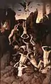 En la parte inferior del panel central, bajo Cristo, se representa al arcángel Miguel pesando las almas, con la iconografía propia del Juicio Final.[10] A sus pies los muertos se levantan de sus tumbas. Algunos están destinados al Paraíso; otros al Infierno. El primero se representa como una catedral, brillantemente iluminada, hacia la que los bienaventurados caminan en calma y actitud orante. El segundo como un terrible lugar hacia el que los condenados se arrastran entre gritos y lamentos. Ambos grupos parecen ser impulsados a su destino final por el sonido que emiten unos ángeles trompeteros.