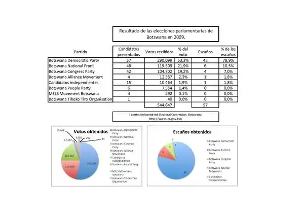 Por otra parte, el presidente es el jefe de estado y de gobierno. El parlamento está dividido en la Casa de Jefes de Botsuana - cámara alta - y la Asamblea Nacional de Botsuana - cámara baja - dominada desde la independencia por el Partido Democrático de Botsuana.