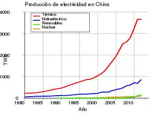 Actualmente China produce cerca de dos tercios de su energía eléctrica en estaciones de energía a base de carbón. En junio de 2007 se informó que aproximadamente cada semana se inauguraban dos plantas nuevas.[14][15] Sin embargo, la producción mediante carbón en China alcanzó su máximo en 2013 y ha descendido desde entonces.[16] Recientemente, China ha cancelado la construcción prevista de más de 100 centrales de carbón, favoreciendo la instalación de energías renovables en su lugar.[16][17][18]