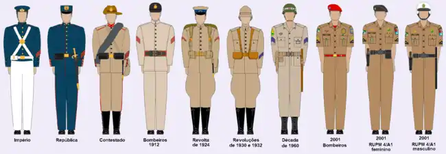Históricamente los militares brasileños heredaran tradiciones lusitanas. Desde la creación hasta los primeros años de la República, la PMPR utilizó uniformes azules (azul ferrete) semejantes a del Ejército Portugués. En 1912[11] se adoptó la color caqui, que tradicionalmente sigue en uso hasta hoy. Los bomberos siempre utilizaran el mismo uniforme de la policía militar, añadiendo solo sus insignias y distintivos.