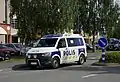 Dos coches de policía finlandeses con marcas bilingües El vehículo de patrulla más común de la policía en Finlandia es el Volkswagen Transporter, generalmente con motores diésel de 2,5 l. En 2002, aproximadamente un tercio de los coches de policía finlandeses eran Transporters. [18] Los transportistas también son utilizados por guardias fronterizos, aduanas y sotilaspoliisi (policía militar). Debido al bilingüismo del país, el lado derecho de los vehículos está marcado en idioma finés (POLIISI), el lado izquierdo está marcado en sueco (POLIS). La sirena utilizada para los coches de policía finlandeses también se utiliza para la policía de Suecia.