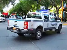 Una camioneta Chevrolet de la Policía de San Juan en una de las esquinas céntricas de la ciudad capital de la provincia