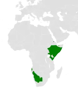 Su hábitat natural son las zonas semiáridas con poca vegetación y árboles dispersos. En el este de África esta especie se encuentra en el sur de Etiopía, Somalia, Kenia, Uganda y el noreste, norte y centro de Tanzania. En el sur de África su rango va desde el sur de Angola, Namibia, el suroeste Botsuana, hasta el norte de Sudáfrica. La gama de esta especie se estima en 2,7 millones de km², y la población total se estima entre 100 000 y 1 millón de aves.[1]