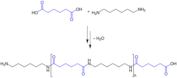 Ejemplo de una poliamida: formación de nylon 6-6 por reacción entre el ácido hexanodioico y hexametilendiamina, los dos grupos funcionales son ácido carboxílico y amina: