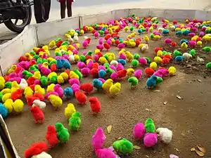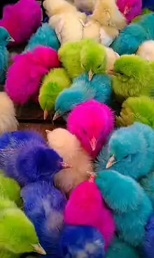 En algunos lugares, teñir pollos ha sido una larga tradición durante la época de Pascua. En países como Estados Unidos, en varias granjas se suelen entintar pollos usando colorantes vegetales de varios colores tales como rojo, neón, azul, amarillo, verde, negro, canela, rosa pastel, entre otros, para venderlos como adornos o juguetes a un precio módico,[3] y una vez que pierden su color debido a que renuevan sus plumas, son abandonados por sus dueños o mueren por negligencia.[4] Sin embargo, en otros países como México, India, Marruecos o Filipinas, la producción es continua y suelen encontrarse en zonas donde abundan tanto turistas como niños, y aunque se suelen pintar con colores intensos usando también colorantes vegetales, la mayoría de las veces se utilizan sustancias tóxicas tales como peróxido (tinte para cabello), colorante para telas, tartrazina, entre otros químicos que podrían ser corrosivos y podrían generar quemaduras.