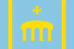 La bandera es apaisada, de proporciones dos de alto por tres de largo, azul clara, con el puente de tres ojos amarillo del escudo, de altura 5/12 de la del paño y anchura 4/9 de la longitud del mismo paño, puesto en el centro y a 1/6 del borde inferior, con una cruz griega patente, también amarilla, de altura 1/6 de la del paño, puesta en el centro y a 1/8 del borde superior, y con dos palos igualmente amarillos, cada uno de grosor 1/18, puestos, uno a 1/9 del borde del asta, y el otro, a 1/9 de la del vuelo.[7]
