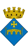 Escudo losanjado: de azur, un puente de oro de 3 ojos sobremontado de una cruz patada de oro y acostado de 2 báculos de oro en palo. Por timbre una corona mural de villa.[6]