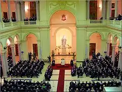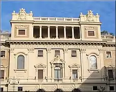 El cuadripórtico central, todo él de travertino, tiene dos ventanales en simetría con las dos escaleras monumentales rematadas con dos áticos que portan los escudos de armas de los papas Gregorio XIII y León XII, fundador y restablecedor del secular instituto, respectivamente.