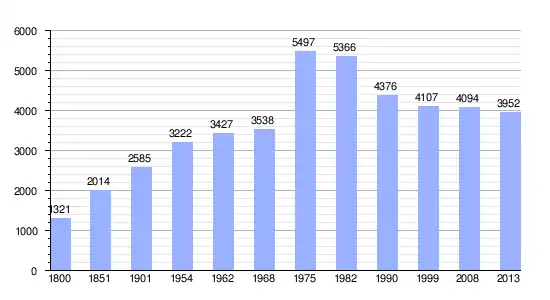 Los datos demográficos contemplados en este gráfico de la comuna de Pontorson[4] se han cogido de 1800 a 1999 de la página francesa EHESS/Cassini, y los demás datos de la página del INSEE.[5]