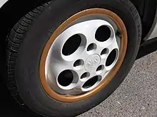 - Llantas de aleación, estilo «dialphone», de 6Jx15 en la parte delantera y 7Jx15 (en la parte trasera).[13] Bajo petición se podía adquirir el código opcional M365, el cual se componía de llantas de aleación 6J x 16 (Et 52,3) y 7J x 16 (Et 52,3), con neumáticos 205/55/ZR16. Las llantas venían pintadas en negro o blanco, con los bordes en ocre o turquesa apropiado.