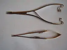 Un ejemplo es el porta aguja de Castroviejo, que se usa comúnmente en cirugía ocular y microcirugía.