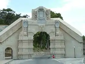 La puerta está coronada por un escudo de armas de mármol rematado por una corona y sostenido por un león y un grifo. Debajo del escudo hay una inscripción en latín que dice: [3]