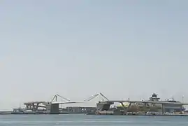 - Detalle de las pilas de hormigón en forma de caja abierta. También son visibles los tubos y los pistones hidráulicos que regulan la apertura y cierre mecánico el puente.