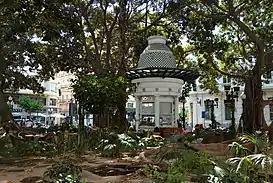 Se divide en cuatro parterres con un eje principal, donde se sitúa su típico quiosco, réplica del kiosco central derribado en los años 1970 para instalar una alberca que durante años albergó la escultura "como una estrella" de Eusebio Sempere. En las cuatro esquinas de la plaza se hallaban pequeños kioscos para la prensa.[1]