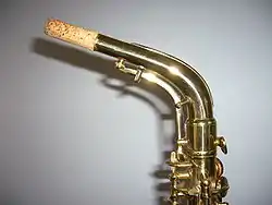 Inusual llave de octava en un saxofón alto de la firma Conn. Normalmente, los saxofones tienen la llave de octava por encima del tudel, y no por debajo, como muestra la imagen.