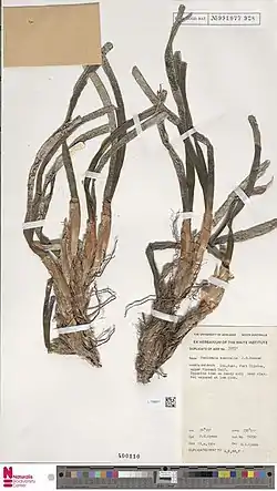 Las hojas son como cintas y tienen un ancho de 11 a 20 milímetros. Son de color verde brillante, volviéndose marrones con la edad. El extremo de la hoja está redondeado o ausente debido al daño. Están dispuestas en grupos con las hojas más viejas en el exterior, más largas y de forma diferente a las hojas más jóvenes que las rodean.[1]