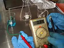 La medida de potencial de las medias-celdas, ya sean iones metálicos o no metálicos se efectúa utilizando como referencia la media-celda de hidrógeno o electrodo normal de hidrógeno que por convención tiene un potencial estándar igual a 0,000 voltios. Los iones más activos que el hidrógeno tendrán potenciales de media-celda mayores y aquellos iones menos activos tendrán potenciales menores, de tal manera que la reacción de reducción ocurrirá en el electrodo de polaridad positiva, la reacción de oxidación en el electrodo de polaridad negativa y el flujo de corriente será del electrodo negativo al positivo del circuito exterior. En las soluciones se produce una migración de iones en sentido opuesto a la polaridad de los electrodos. El cálculo del potencial de una celda (E) se efectúa restando el potencial de la celda menos positiva ( Ered ) del potencial de la celda más positiva ( Eox ):