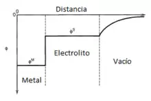 Si una fase conductora con un exceso de carga se pone en contacto con otra, las cargas de ambas se arreglarán de tal forma que en un lado de la interfase las cargas son iguales y opuestas a las del lado contrario.[5] Estas cargas distribuidas a ambos lados de la superficie de contacto entre las fases, crean una diferencia de potencial. Esta diferencia es llamada diferencia de potencial de Galvani[6] o diferencia de potencial interfacial (ΔΦ), ya que su magnitud es la diferencia entre los potenciales internos de cada fase. Este fenómeno puede ocurrir incluso entre superficies conductoras sin excesos de carga debido a la posible orientación no aleatoria de los dipolos magnéticos con respecto a una de las fases. La diferencia de potencial Galvani afecta la cinética del transporte de masa y la afinidad electrónica de los metales en la interfase, por lo que controla la dirección de la reacción que se lleve a cabo.[1] Esta diferencia de potencial está conectada con la formación de una doble capa eléctrica en la interfase. En el equilibrio descrito por el potencial electroquímico, la diferencia de potencial de Galvani depende solo de las propiedades de las fases involucradas, no depende de las condiciones de la interfase (tamaño, contaminantes, etc.).[7]