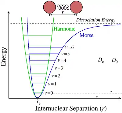 Mientras que el espaciamiento de energía entre niveles vibracionales en el oscilador armónico cuántico es constante (con un valor de ), la energía entre niveles adyacentes en el oscilador de Morse disminuye conforme aumenta . Por lo tanto, este espaciamiento entre niveles de Morse puede describirse con la expresión: