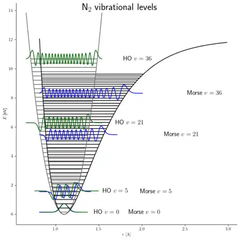 Por debajo de ese nivel máximo , es una buena aproximación para el valor vibracional verdadero en moléculas diatómicas que no rotan. De hecho, el espectro molecular real generalmente se ajusta a la forma:
