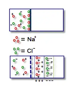 donde a1 y a 2 son las actividades de HCl en los electrodos de un lado y otro de la membrana, respectivamente, t+ el número de transporte para el H+ y t- es el número de transporte del ion Cl-.[4]