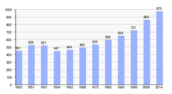 Los datos demográficos contemplados en este gráfico de la comuna de Pouilly-le-Monial[4] se han cogido de 1800 a 1999 de la página francesa EHESS/Cassini, y los demás datos de la página del INSEE.[5]