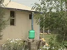 - Un método consiste en utilizar el suelo como un disipador de calor aspirando aire a través de tuberías subterráneas.[54] Esto se hace a menudo para proporcionar una fuente de aire fresco para un edificio por medio de un intercambiador en pozos canadienses (también conocido como tubos tierra), en el que la condensación está considerada generalmente como un problema significativo.[55] Un problema importante con estos diseños es que los tubos subterráneos están sujetos a contaminación y son difíciles de mantener limpios. Los diseños de este tipo requieren de aire que se suministrará a través de las tuberías por un ventilador, pero la potencia necesaria se puede proporcionar (o complementar) por un aerogenerador.[56]