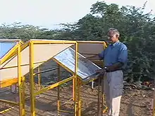 - Otro tipo de colector de agua atmosférico hace uso de desecantes que absorben agua de la atmósfera a temperatura ambiente, esto hace que sea posible extraer la humedad, incluso cuando la humedad relativa es tan baja como un 14 por ciento.[57] Los sistemas de este tipo han demostrado ser muy útiles como suministros de emergencia de agua potable.[58][59] Para la regeneración, el desecante necesita ser calentado.[60] En algunos diseños la energía de regeneración se suministra por el sol; el aire se ventila en la noche sobre un lecho de desecantes que absorben el vapor de agua. Durante el día, las instalaciones están cerradas, el efecto invernadero aumenta la temperatura, y como en las piscinas de desalinización solar, el vapor de agua se desprende parcialmente, se condensa en una parte fría y se recoge.[4]