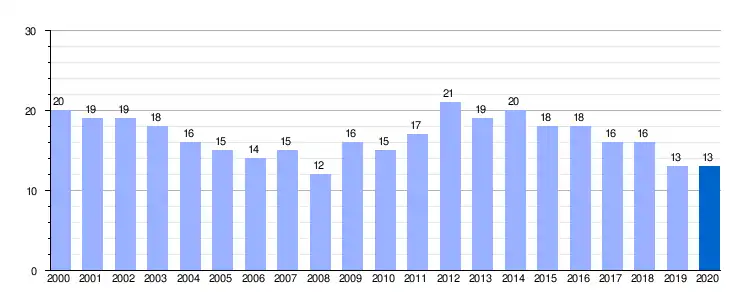 Gráfica de evolución demográfica de Pozuelos del Rey entre 2000 y 2020