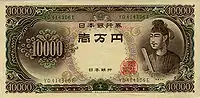 En la época, se emitieron dos billetes hechos con diferentes tipos de materiales y tintas especiales con un valor nominal de 100 000 000 (cien millones de yenes).[5] La característica de estos billetes es que tienen un borde a su alrededor para evitar su alteración. Como distintivo, tiene un sello y figuras en diferentes posiciones comenzando desde el medio hacia afuera. Estos boletos de tela se usaron para el intercambio de valores importantes en ese momento. Más recientemente, su rostro ha aparecido en los billetes de 100, 1000, 5000 y 10 000 yenes.