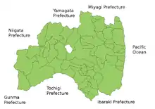 Fukushima es la prefectura más meridional de la región de Tōhoku, y la más cercana a Tokio. Está dividida mediante cadenas montañosas en tres regiones llamadas (de oeste a este) Aizu, Nakadōri y Hamadōri.