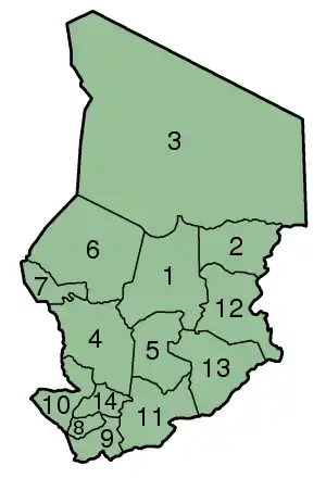 Chad se encontraba dividido en 14 prefecturas desde 1960, año de su independencia, hasta 1999, cuando el país fue dividido nuevamente en 28 departamentos: