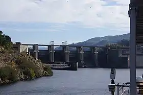 La presa tiene una altura de 57 m, una longitud de coronación de 400 m y una esclusa para el paso de barcos.