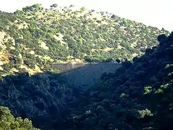 ![]() Cara sur (aguas abajo) de la presa de El Gasco, vista desde el término municipal de Las Rozas de Madrid (Madrid), cerca de la urbanización Molino de la Hoz. | ||