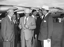 Los británicos protestaron enérgicamente por la nacionalización y formaron un plan con Francia e Israel para capturar el canal. [88] Eisenhower se opuso a la intervención militar, y repetidamente le dijo al Primer Ministro británico Anthony Eden que Estados Unidos no toleraría una invasión.[89] Aunque se opuso a la nacionalización del canal, Eisenhower temía que una intervención militar interrumpiría el comercio mundial y alienaría a los países del Medio Oriente de Occidente. [90] Israel atacó a Egipto en octubre de 1956, rápidamente tomando el control de la península del Sinaí . Francia y Gran Bretaña lanzaron ataques aéreos y navales después de que Nasser se negara a renunciar a la nacionalización egipcia del canal. Nasser respondió hundiendo docenas de barcos, evitando la operación del canal. Enfurecido por los ataques, que corrían el riesgo de enviar a los estados árabes a los brazos de la Unión Soviética, la administración Eisenhower propuso un alto el fuego y utilizó la presión económica para obligar a Francia y Gran Bretaña a retirarse. [91] El incidente marcó el final del dominio británico y francés en el Medio Oriente y abrió el camino para una mayor participación estadounidense en la región.[92] A principios de 1958, Eisenhower utilizó la amenaza de sanciones económicas para obligar a Israel a retirarse de la península del Sinaí, y el Canal de Suez reanudó las operaciones bajo el control de Egipto. [93]