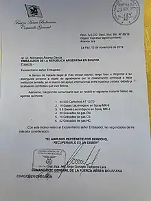 - «Una investigación en Bolivia insiste en que la carta en agradecimiento al gobierno argentino por el “material bélico” es falsa». Infobae. 10 de julio de 2021. Consultado el 10 de julio de 2021.