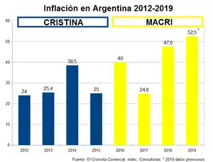La política para contener la inflación y la cotización del dólar estuvo basada, en una primera etapa, en metas de inflación y luego en una política de control de agregados monetarios.[55] En este proceso se aumentó la tasa de interés de referencia a un valor del 60%, siendo el más alto del mundo.[56][57][58] Esta política, sin embargo, falló en controlar la cotización del dólar, superó los $60 a fines de 2019.[59] Tampoco logró controlar la inflación, que promedió el 40% anual durante la gestión de Macri y acumuló un aproximado de 300% hacia finales de 2019.[60] En 2018 la economía nacional de Argentina fue calificada como hiperinflacionaria por el organismo regulador de Estados Unidos, la Security and Exchange Commission (SEC), basándose en las Normas Internacionales de Información Financiera (NIIF), que regulan la presentación de balances de las empresas que cotizan en Bolsa en todo el mundo.[61] En tanto la moneda argentina, el peso, fue la moneda emergemte de peor desempeño entre enero y febrero de 2018.[62][63][64]
