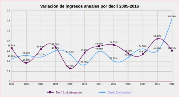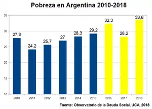 Esta combinación de recesión y alta inflación provocó un deterioro de los indicadores sociales. Desde un valor cercano al 30% en diciembre de 2015, la pobreza llegó a 35,4% en el primer semestre de 2019 y se estima que puede llegar al 40% al terminar el año.[67] La indigencia a su vez llegó al 7,7% de la población. Según un estudio de la consultora Delfos la clase media, se redujo del 30% al 25% a fines de 2017.[68] La nueva metodología para medir la pobreza implementada por el gobierno de Macri fue objeto de críticas, debido a ciertas inconsistencias con otros indicadores, como el desempleo, el aumento del precio de los alimentos y la desocupación medida por el Gobierno de la Ciudad de Buenos Aires.[69]