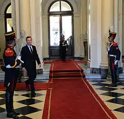 Más tarde se dirigió hacia la Casa Rosada, un trayecto de algo más de 1 km, durante el que recibió el saludo de unos centenares de vecinos.[29] Allí recibió el bastón y la banda presidencial en el Salón Blanco de manos del presidente provisional del Senado, Federico Pinedo, acompañado de la vicepresidenta Gabriela Michetti, el presidente de la cámara de Diputados Emilio Monzó y el presidente de la Corte Suprema Ricardo Lorenzetti.[31] Realizó una recepción en el Palacio San Martín de la Cancillería argentina a todos los jefes de estado presentes (Michelle Bachelet, Horacio Cartes, Juan Manuel Santos, Rafael Correa, Evo Morales, Dilma Rouseff, y Juan Carlos I) y representantes de otros países.[32] Tomó juramento a su gabinete en el Museo del Bicentenario,[33] y por la noche presenció una función especial en el Teatro Colón.[34]